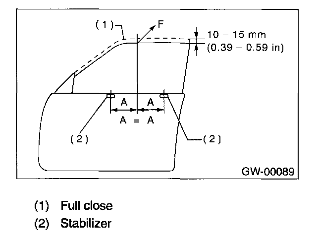 3. Lower door glass 10 to 15 mm (0.39 to 0.59 in) from fully closed position. While applying outward pressure of 45 ± 5 N (4.59 ± 0.51 kgf, 10.1 ± 1.1 lb) (F) to upper edge of glass above midpoint of two outer stabilizers, press inner stabilizer at 10 ± 5 N (1.02 ± 0.51 kgf, 2.2 ± 1.1 lb) until it just touches the glass, then secure it.