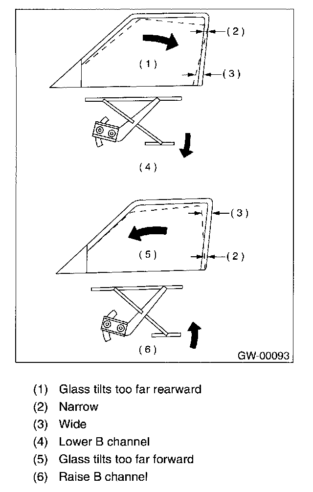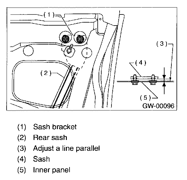 CAUTION: Do not tilt sash bracket to inner panel during adjustment. Otherwise smooth regulator operation cannot be achieved.