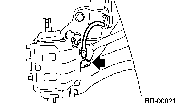 ^ A wear indicator is provided on the inner disc brake pad. If the pad wears down to such an extent that the end of the wear indicator contacts the disc rotor, a squeaking sound is produced as the wheel rotates. If this sound is heard, replace the pad.