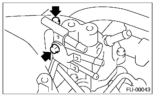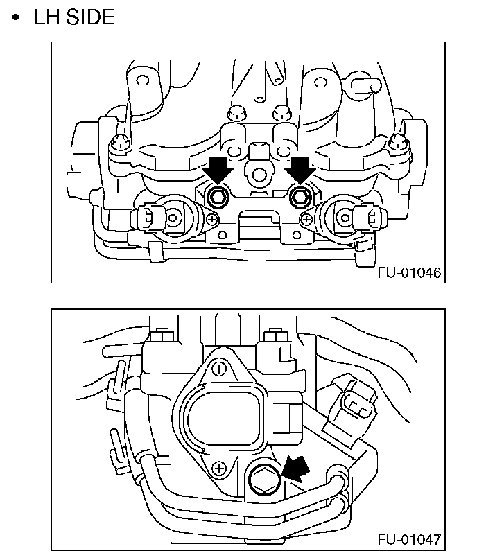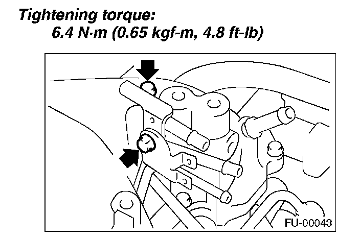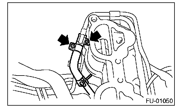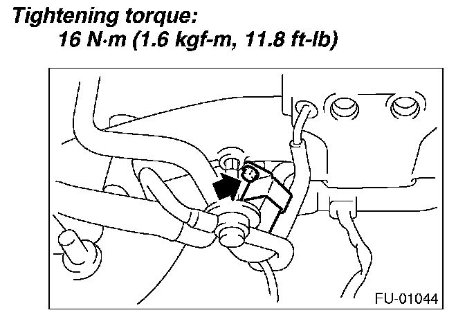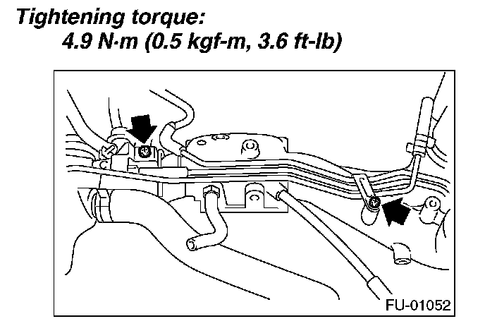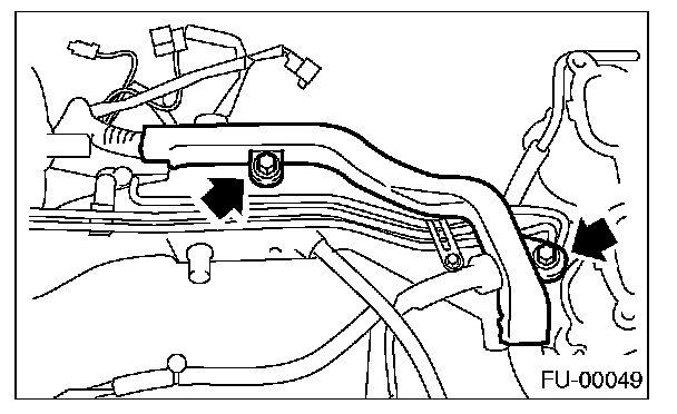 11. Tighten the two bolts which install the fuel pipes on the left side of intake manifold.