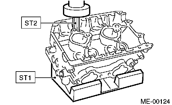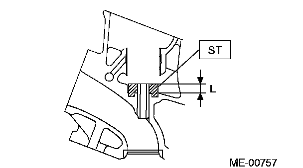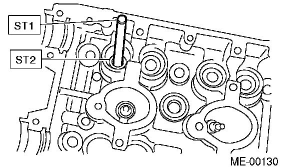 e Put a new valve guide, coated with sufficient oil, in cylinder, and insert ST1 into valve guide. Press in until the valve guide upper end is flush with the upper surface of ST2.