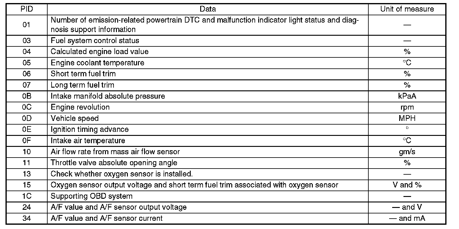 A list of the support data and PID (Parameter Identification) codes are shown in the table.