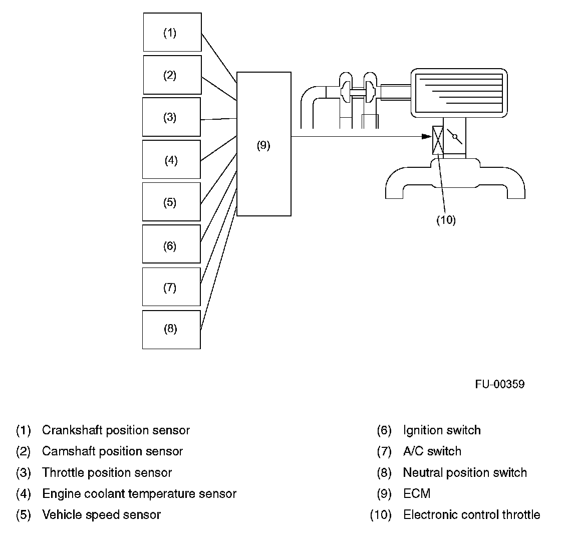 IDLE AIR CONTROLThe ECM controls the electronic control throttle based on signals from the crankshaft position sensor, engine coolant temperature sensor, air flow sensor, manifold absolute pressure sensor and A/C switch so that the proper idle speed for each engine load is achieved.