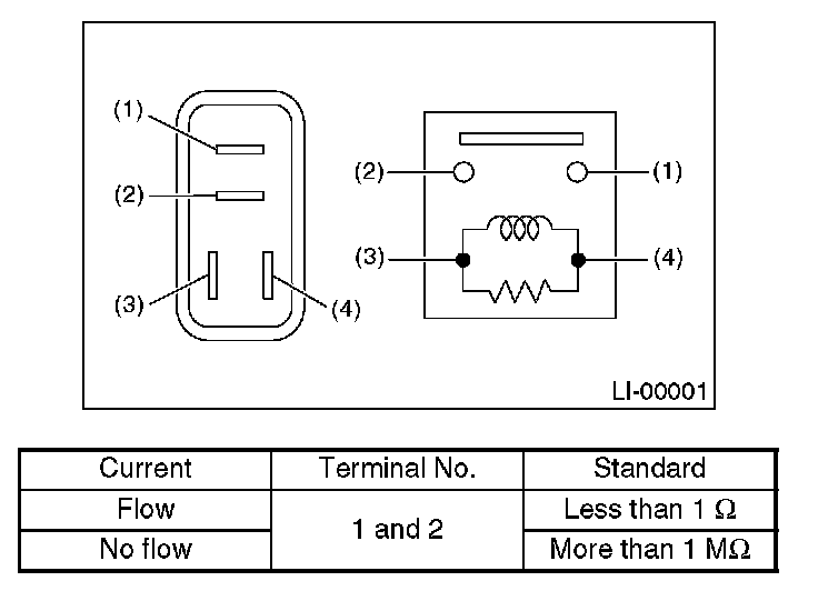 Measure tail and illumination relay resistance between terminals while connecting terminal No.4 to battery positive terminal No.3 to battery ground terminal.