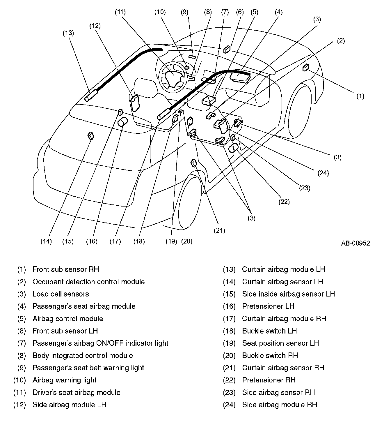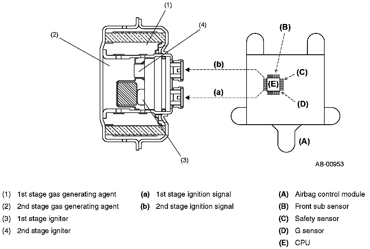 The control module receives electric signals from the safety sensor and electric sensor inside the module and also from the front sub sensor to detect the deceleration of the vehicle and judge whether the airbag and pretensioners should be ignited or not. It also has a self diagnosis function which lights up the airbag warning light in the combination meter if a fault occurs in the system. Diagnostic trouble codes generated by the self diagnosis function are stored in the memory in the module.