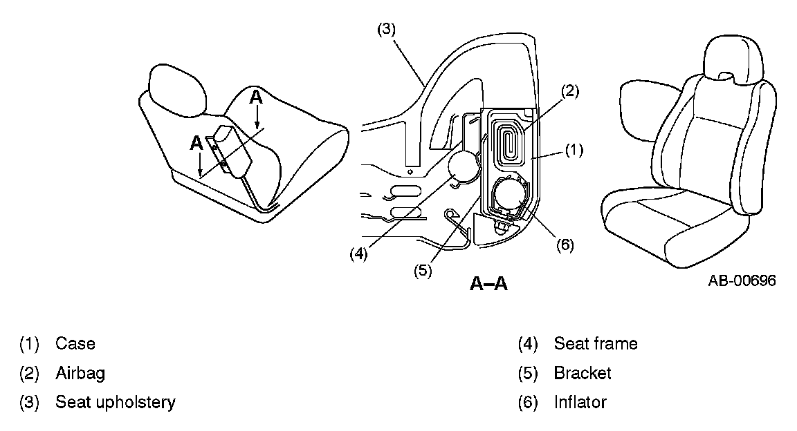 The SRS side airbag module assembly cannot be disassembled. The side airbag module is fixed to the seat frame with a bracket, and consists of an inflator, airbag, and a case.