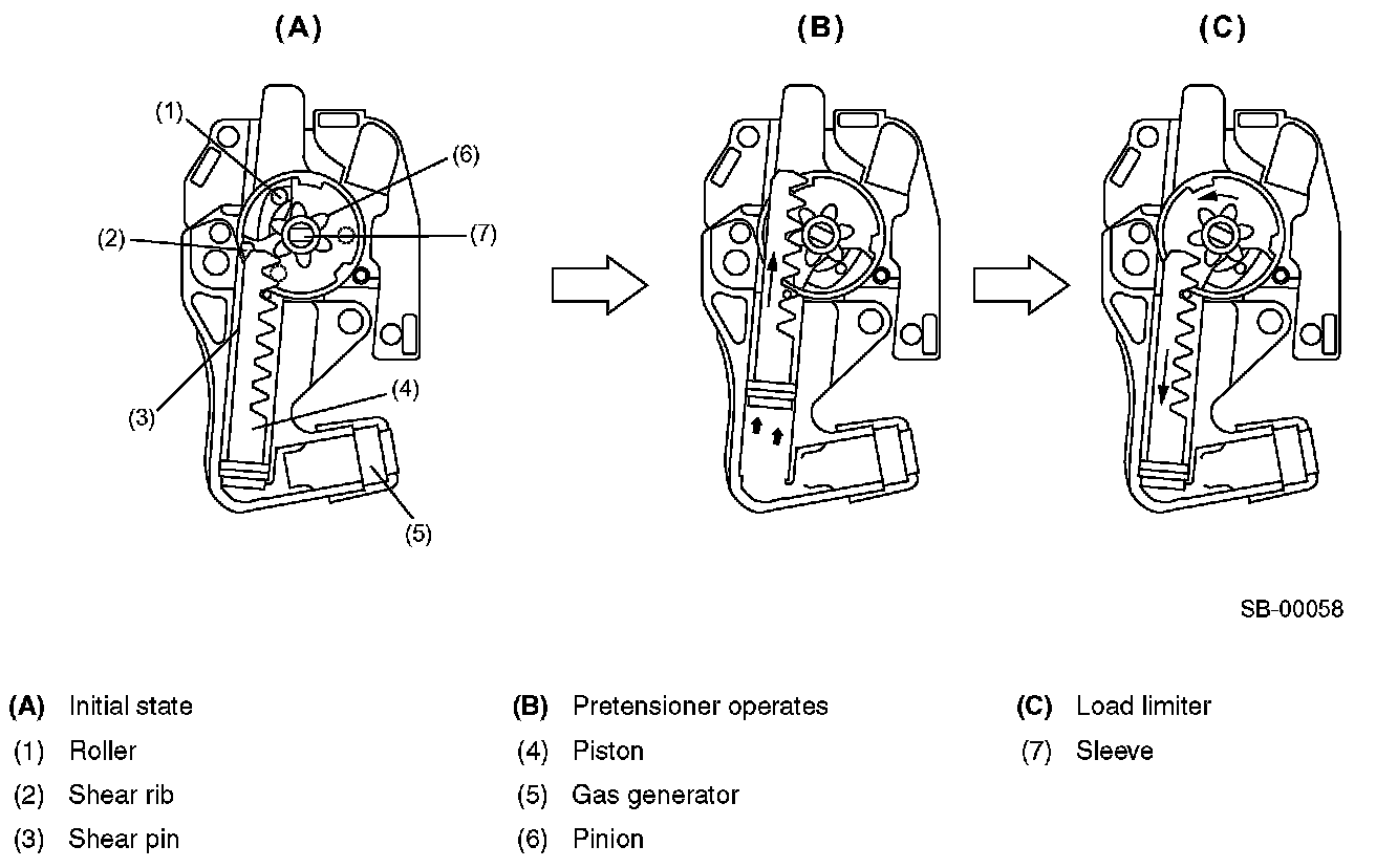 The airbag control module controls the operation of the seat belt pretensioner. If the front sub sensor and the sensors inside the airbag control module detect an impact exceeding a specified level, the driver's seat and front passenger's seat airbags are deployed almost simultaneously. Upon receiving signals from the airbag control module the gas generator inside the pretensioners are ignited and the gas pressure retracts the seat belts in a very short time to improve the passenger restraint effect.