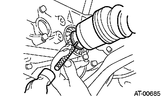 1. While holding the joint portion of front drive shaft with your hand, push the housing outside to prevent AAR side of boot from stretching, and then remove the front drive shaft from transmission.