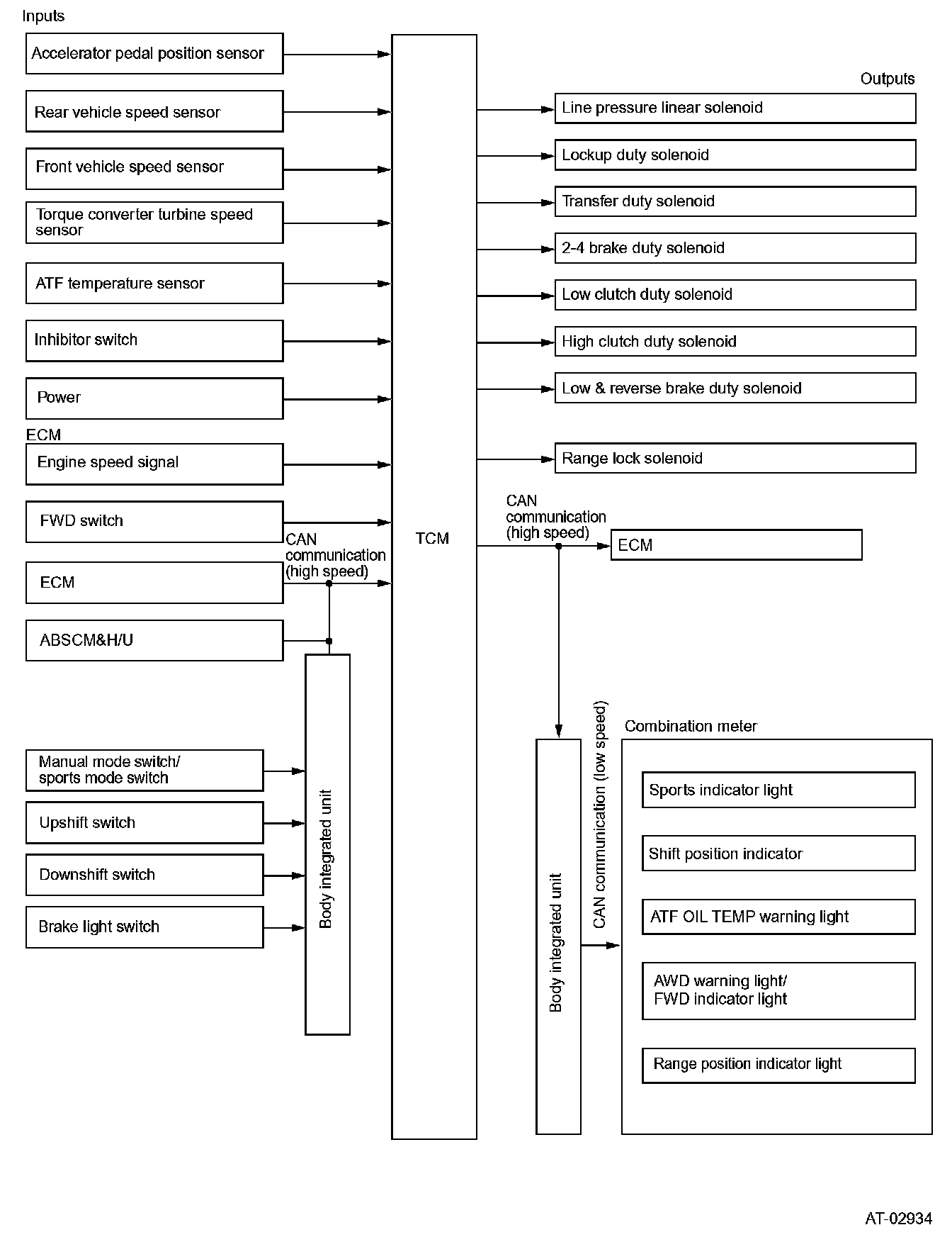 GENERALThe electro-hydraulic control system for the transmission and transfer consists of various sensors and switches, a transmission control module (TCM) and the control valves including solenoid valves. The system controls the automatic transmission operation, including gear shifting, lockup clutch operation, line pressure, pattern selection (NORMAL and SPORTS), and gear-shift timing. It also controls the operation of the transfer clutch. The TCM determines the vehicle's operating conditions from various input signals and controls a total of seven solenoids (line pressure linear solenoid, lockup duty solenoid, 2-4 brake duty solenoid, low clutch duty solenoid, high clutch duty solenoid, low & reverse duty solenoid, and transfer duty solenoid) by sending appropriate signals to them.