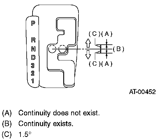 3. Check if there is continuity at equal points when the select lever is turned 1.5° in both directions from N range.