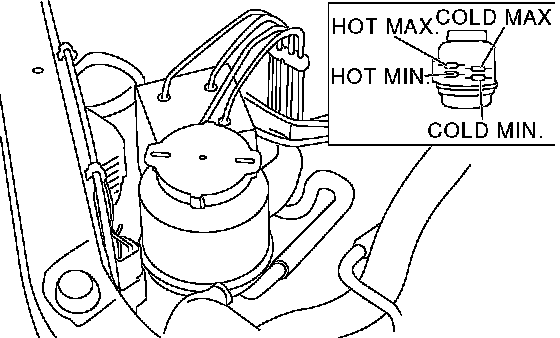 3. Inspect fluid level on flat and level surface with engine OFF by indicator of reservoir tank.