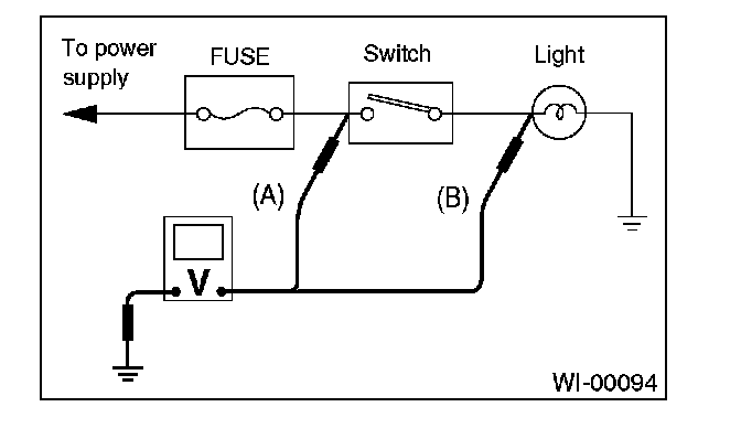2. Contact the positive lead of the voltmeter on connector (A). The voltmeter will indicate a voltage.