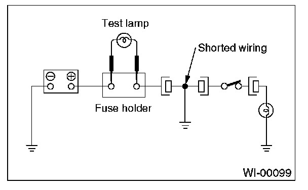 Connect a test lamp (rated at approx. 3 watts) in place of the blown fuse and allow current to flow through the circuit. Disconnect one connector at a time from the circuit, starting with the one located farthest from power supply. If the test lamp goes out when a connector is disconnected, the wiring between that connection and next connector (farther from the power supply) is shorted.