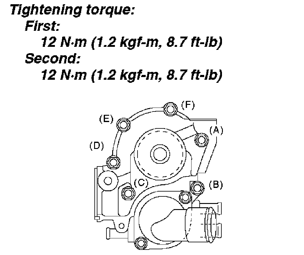 ^ When installing the water pump, tighten bolts in two stages in alphabetical sequence as shown in the figure.