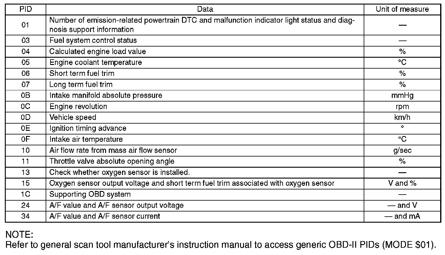 A list of the support data and PID (Parameter Identification) codes are shown in the table.