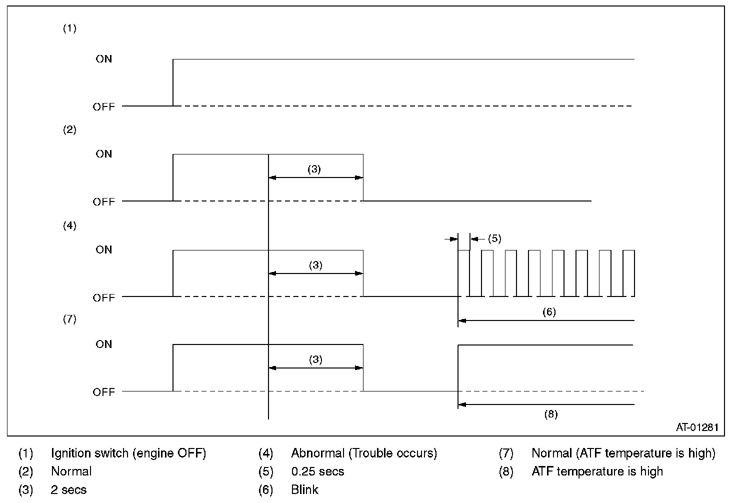 OPERATIONWhen any on-board diagnostics item is malfunctioning, the display on AT OIL TEMP warning light blinks from the time malfunction is detected after starting the engine until ignition switch is turned to OFF. The malfunctioning part or unit can be determined by a DTC during on-board diagnostics operation. Problems which occurred previously can also be identified through the memory function. If the power indicator does not show a problem (although a problem is occurring), the problem can be determined by checking the performance characteristics of each sensor using Subaru Select Monitor. The indicator signal is as shown in the figure.