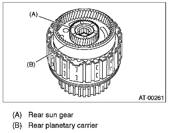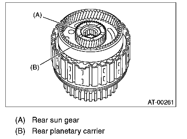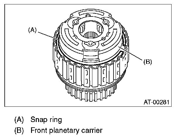 27. Measure and record the clearance B between the retaining plate and snap ring. (Reverse clutch) At this time, do not press down the retaining plate.