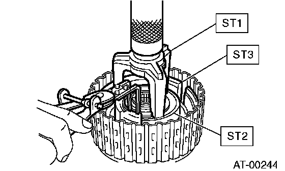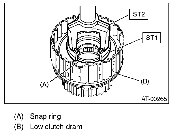 7. Compress the spring retainer, and remove the snap ring from low clutch drum using ST1 and ST2.