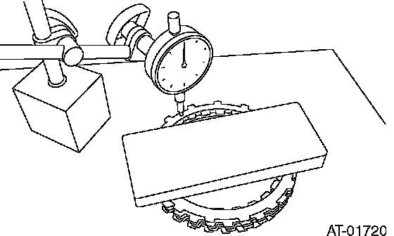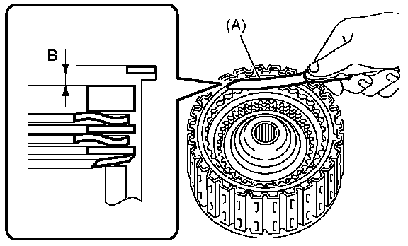 17. Measure and record the clearance B between the retaining plate and snap ring. (High clutch) At this time, do not press down the retaining plate.