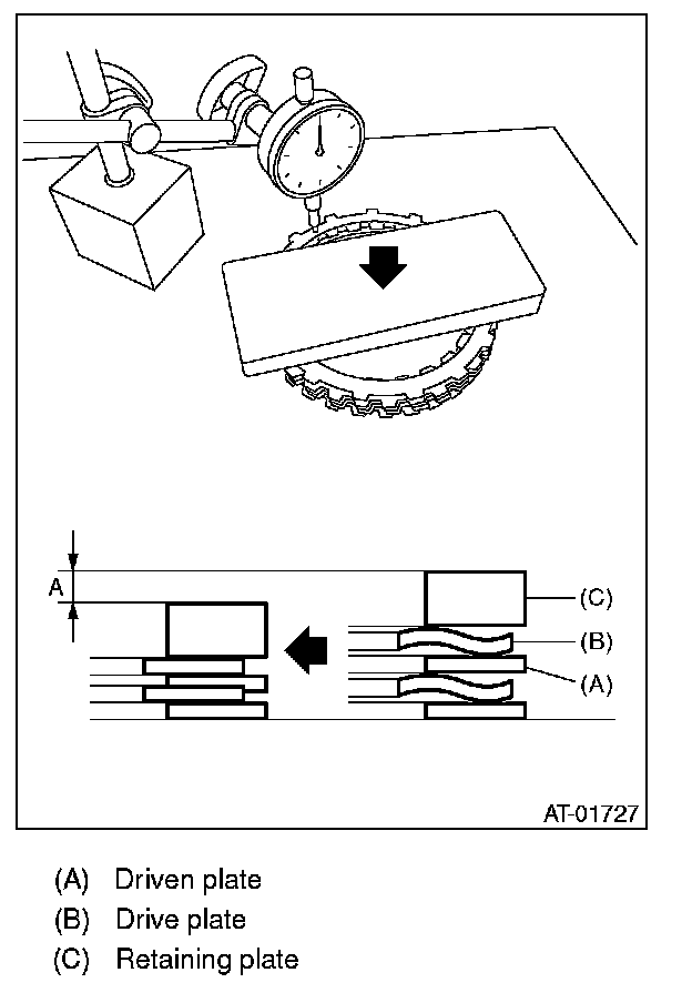 Select the retaining plate within the specification by calculating with A and B dimensions which have been recorded before. If the calculated value exceeds the usage limit, replace the drive plate with a new one and adjust it within the specification.