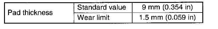 ^ A wear indicator is provided on the inner disc brake pad. If the pad wears down to such an extent that the end of wear indicator contacts disc rotor, a squeaking sound is produced as the wheel rotates. If this sound is heard, replace the pad.