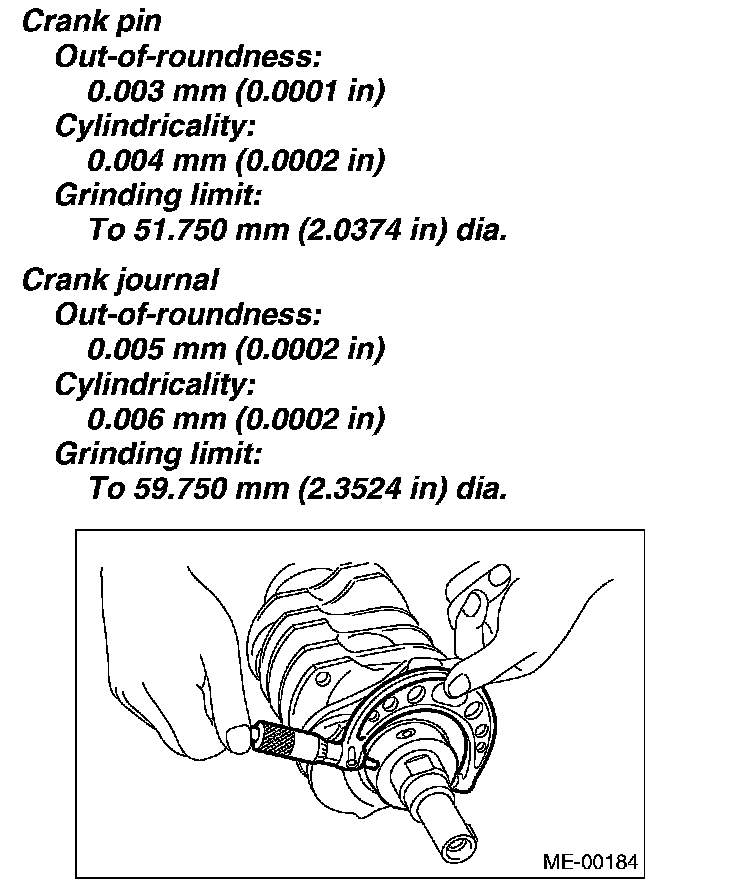 3) Inspect the crank journal and crank pin for wear. If they are not within the specifications, replace the bearing with a suitable (undersize) one, and replace or recondition crankshaft as necessary. When grinding the crank journal or crank pin, finish them to the specified dimensions according to the undersize bearing to be used.