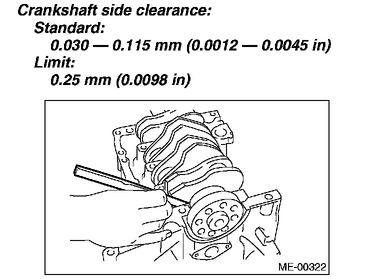4) Measure the side clearance of crankshaft at center bearing. If clearance exceeds the limit, replace the bearing.