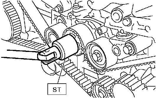 (1) Turn the cam sprocket No. 2 using ST1, and turn the cam sprocket No. 1 using ST2 so that their alignment marks (A) come to top positions. ST1 18231 AA010 CAM SPROCKET WRENCH