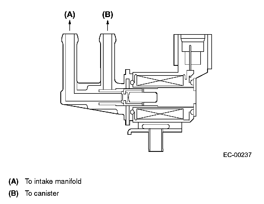 The purge control solenoid valve is on the evaporation line between the canister and intake manifold. The valve is installed under the intake manifold.