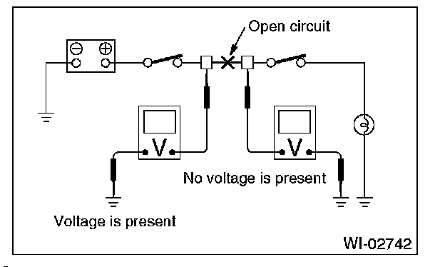 An open circuit is determined by measuring the voltage between respective connectors and ground using a voltmeter, starting with the connector closest to power supply. The power supply must be turned ON so that current flows in the circuit. If voltage is not present between a particular connector and ground, the circuit between that connector and previous connector is open.