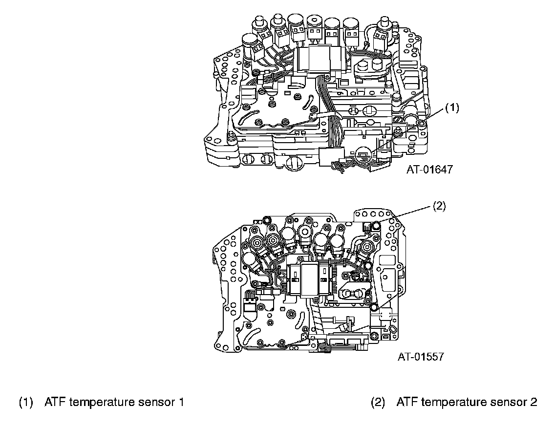 ATF TEMPERATURE SENSOR 1, 2These temperature sensors are thermistors and each of them is mounted on the control valve body. ATF temperature sensor 1 detects the ATF temperature in the oil pan, and ATF temperature sensor 2 detects the ATF temperature at the torque converter outlet; each sensor outputs electrical resistance signals.