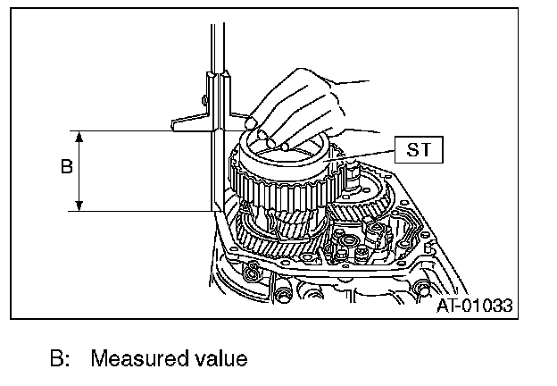 3. Using ST, measure height "B" from transmission case joining edge to center differential clutch drum edge.