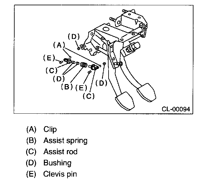 3. Align bores of pedal bracket, clutch pedal and brake pedal, attach the brake pedal return spring, assist rods, spring, and bushing.