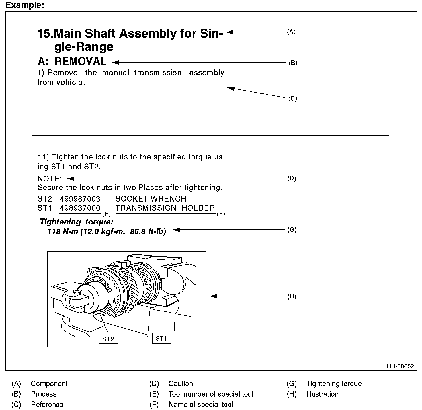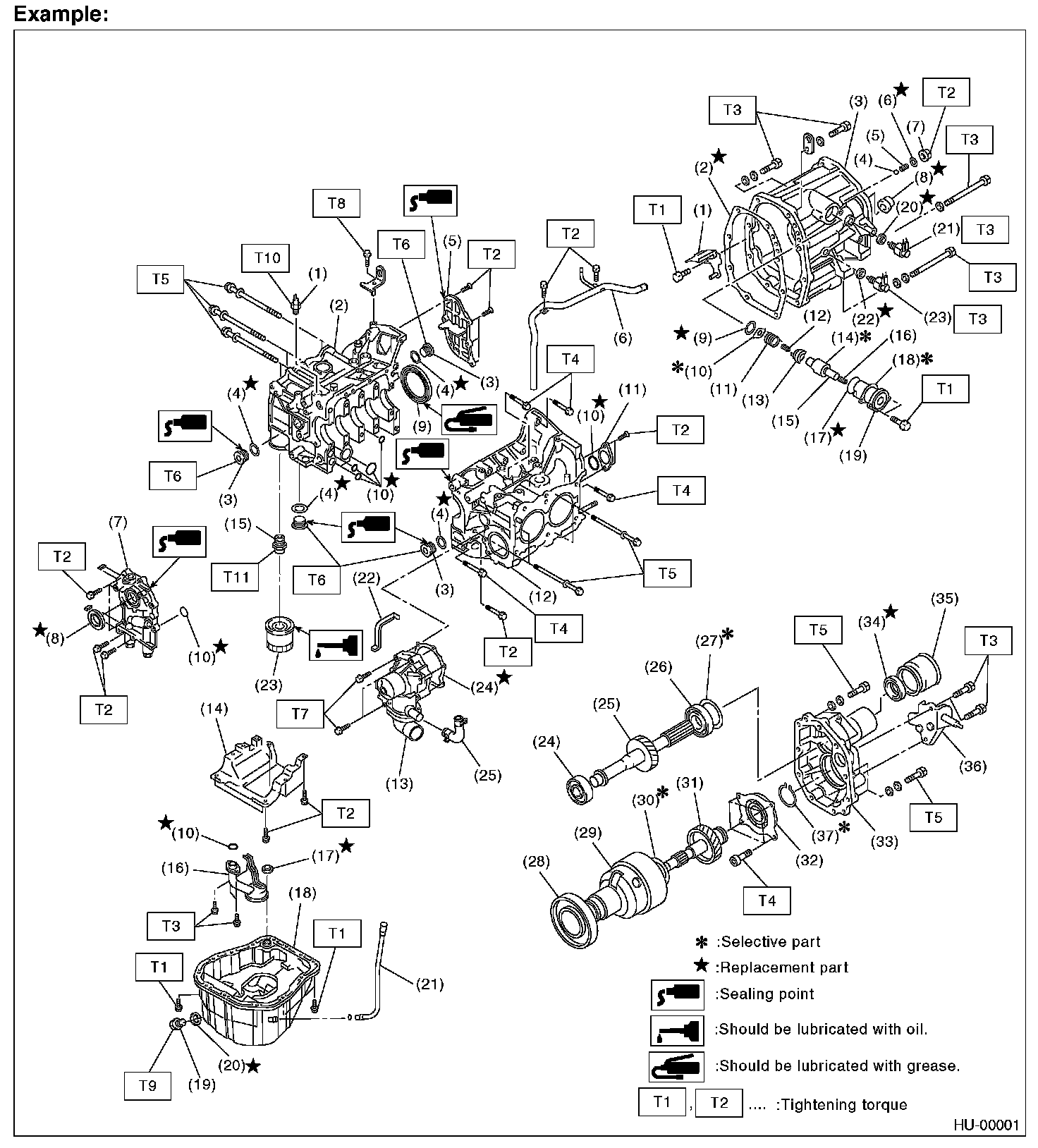 Illustrations are listed for each component. The information necessary for repair work (tightening torque, grease up points, etc.) is described on these illustrations. Information is described using symbol. To order the parts, refer to parts catalogue.
