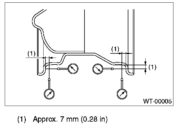 4. If the rim runout exceeds specifications, remove the tire from rim and check runout while attaching the dial gauge to positions shown in the figure.