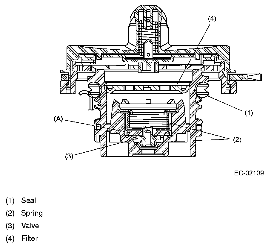 When there is no problem with the fuel vapor line, the filler pipe is sealed at the portion (A) and by the seal pressed against the filler pipe end. If vacuum develops in the fuel tank, the atmospheric pressure forces the spring down to open the valve; consequently outside air flows into the fuel tank, thus controlling the inside pressure.