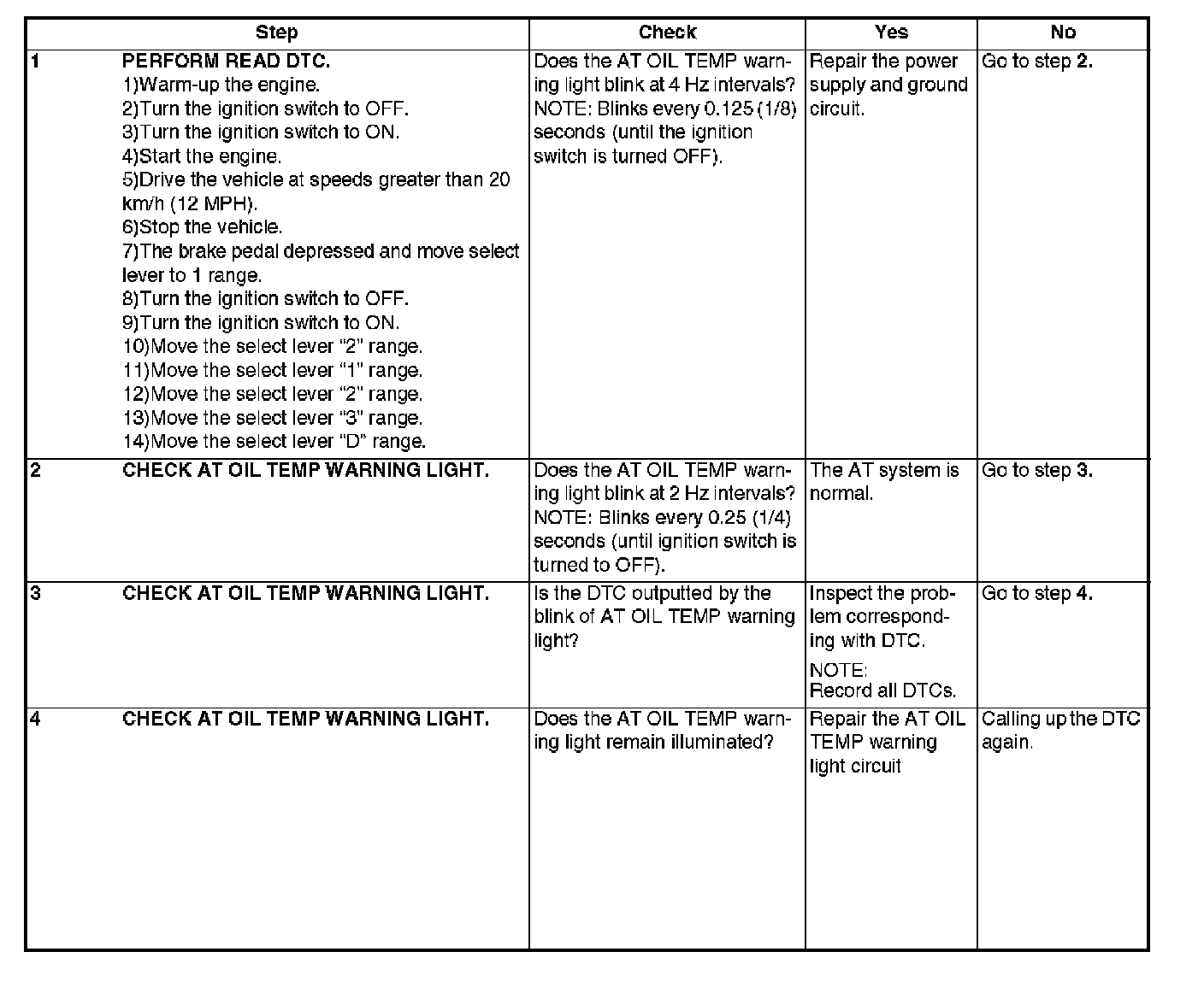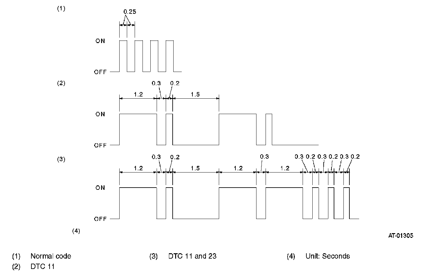 The AT OIL TEMP warning light flashes the code corresponding to faulty part. The long segment (1.2 seconds on) indicates a "ten", and the short segment (0.2 seconds on) signifies a "one".
