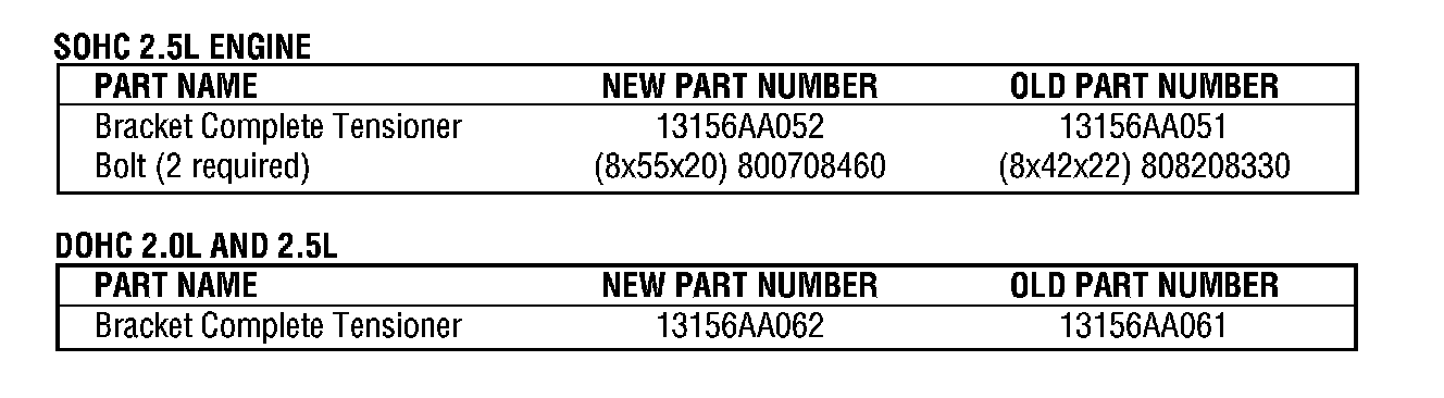 This Service Bulletin is to inform of a modification made to the timing belt tensioner bracket to prevent a knocking noise. On SOHC engines, the shape of the bracket and the size of the 2 (upper side) installation belts were changed. On DOHC engines, the shape of the bracket was changed and ribs added to increase rigidity.