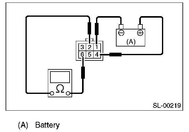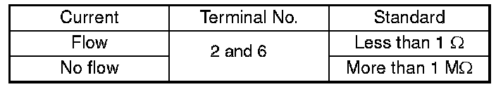 Measure the interrupt relay resistance between terminals (indicated in the table) when connecting terminal No. 4 to battery positive terminal and terminal No. 1 to battery ground terminal.