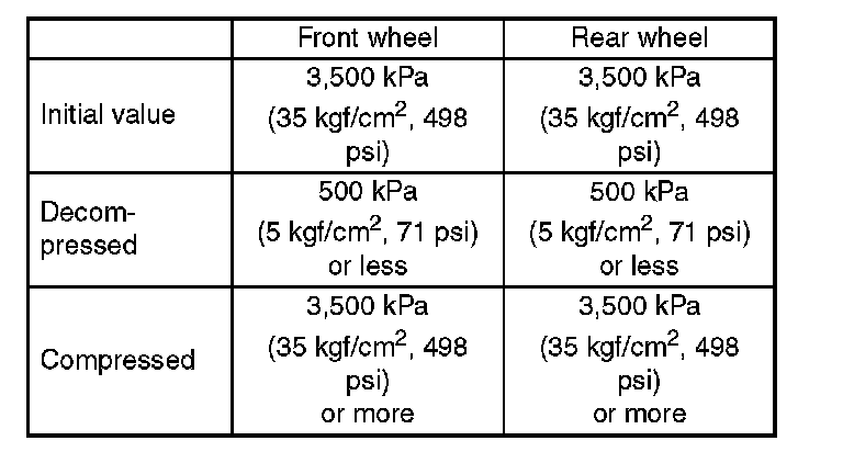 7) Read values indicated on the pressure gauge and check if the fluctuation of the values between decompression and compression meets the standard values. Also check if any irregular brake pedal tightness is felt.