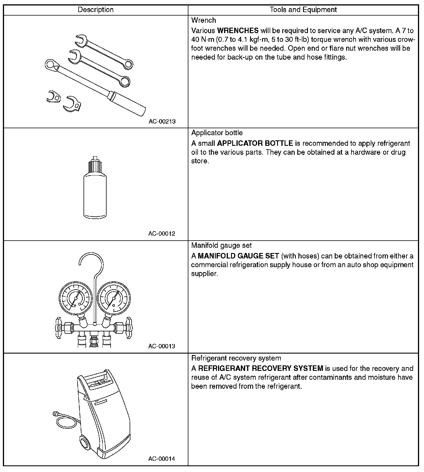 PREPARATION TOOLCAUTION: When working on vehicles with the HFC-134a system, only use HFC-134a specified tools and parts. Do not mix with CFC-12 tools and parts. If HFC-134a and CFC-12 refrigerant or compressor oil is mixed, poor lubrication will result and the compressor itself may be destroyed.