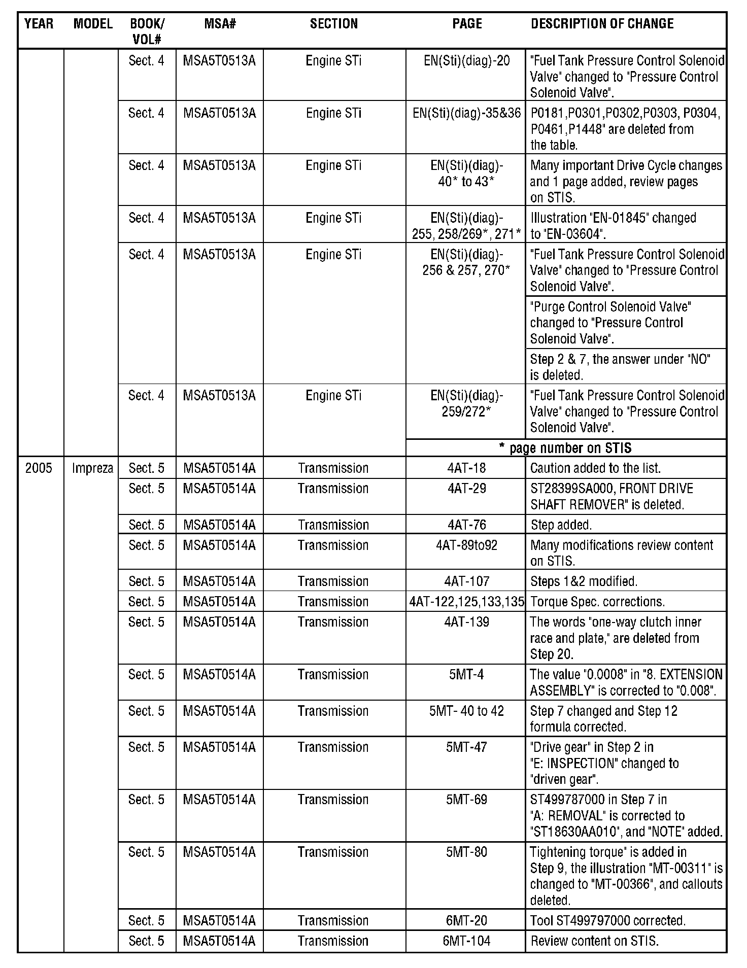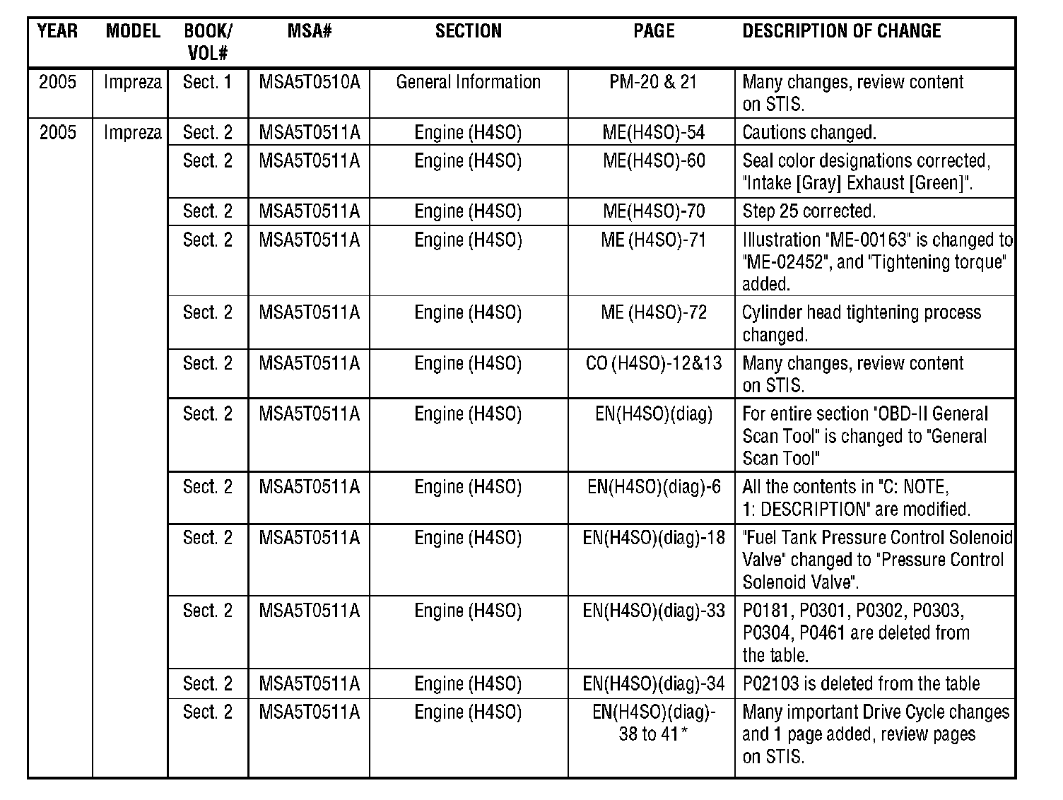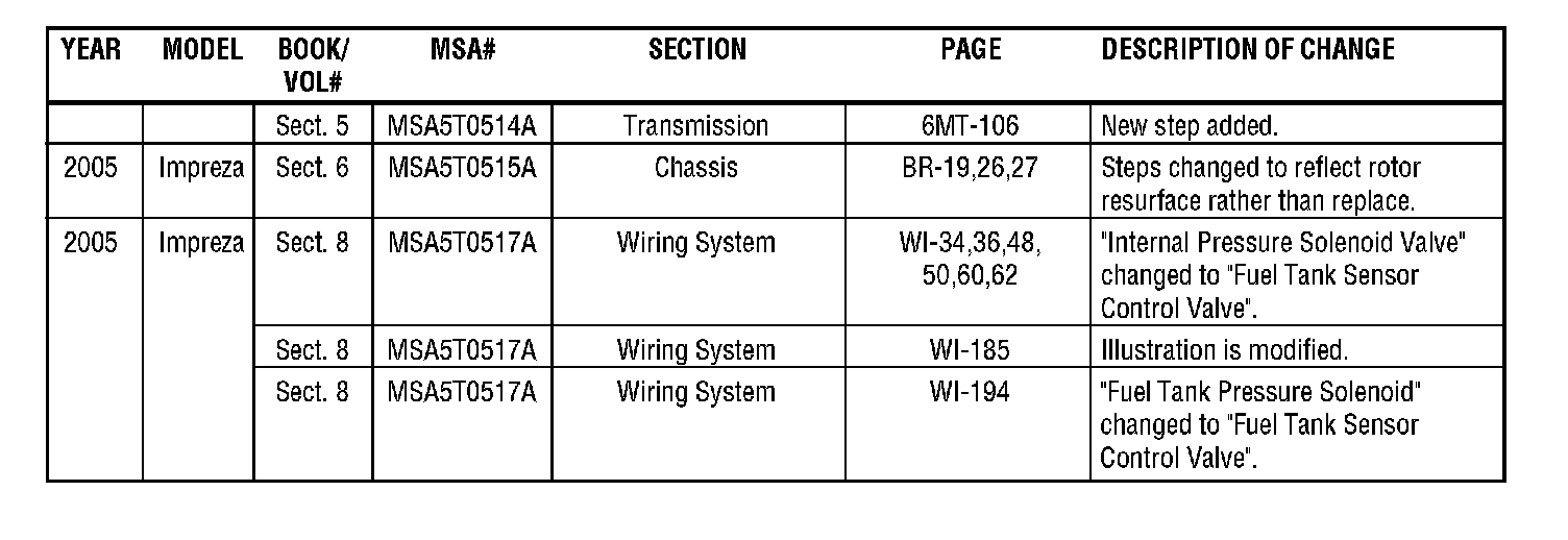The purpose of this bulletin is to provide a description of current changes to Service Manuals available via the Subaru Technical Information System (STIS) website. The tables contained within this bulletin are to be used as guides for becoming aware of the latest changes, and can be used to update printed copies in conjunction with the PDFs available on the STIS website. Printed pages will not be made available to update printed Service Manuals.
