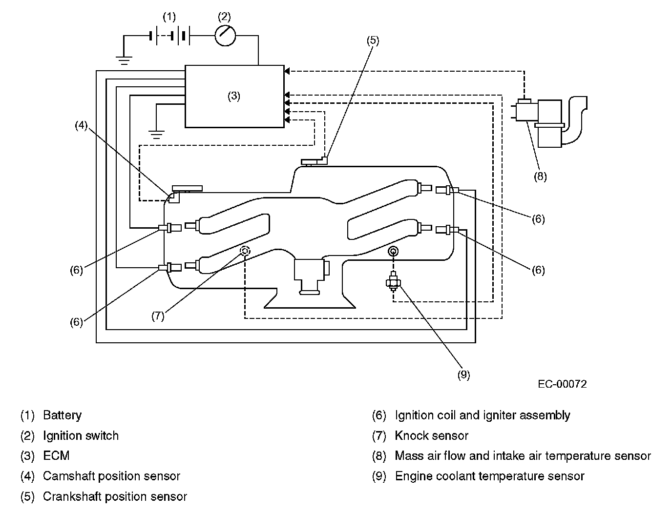 The ECM monitors the operating condition of the engine using the signals from the sensors and switches shown and determines the ignition timing most appropriate for each engine operating condition. Then it sends a signal to the igniter, commanding generation of a spark at that timing.
