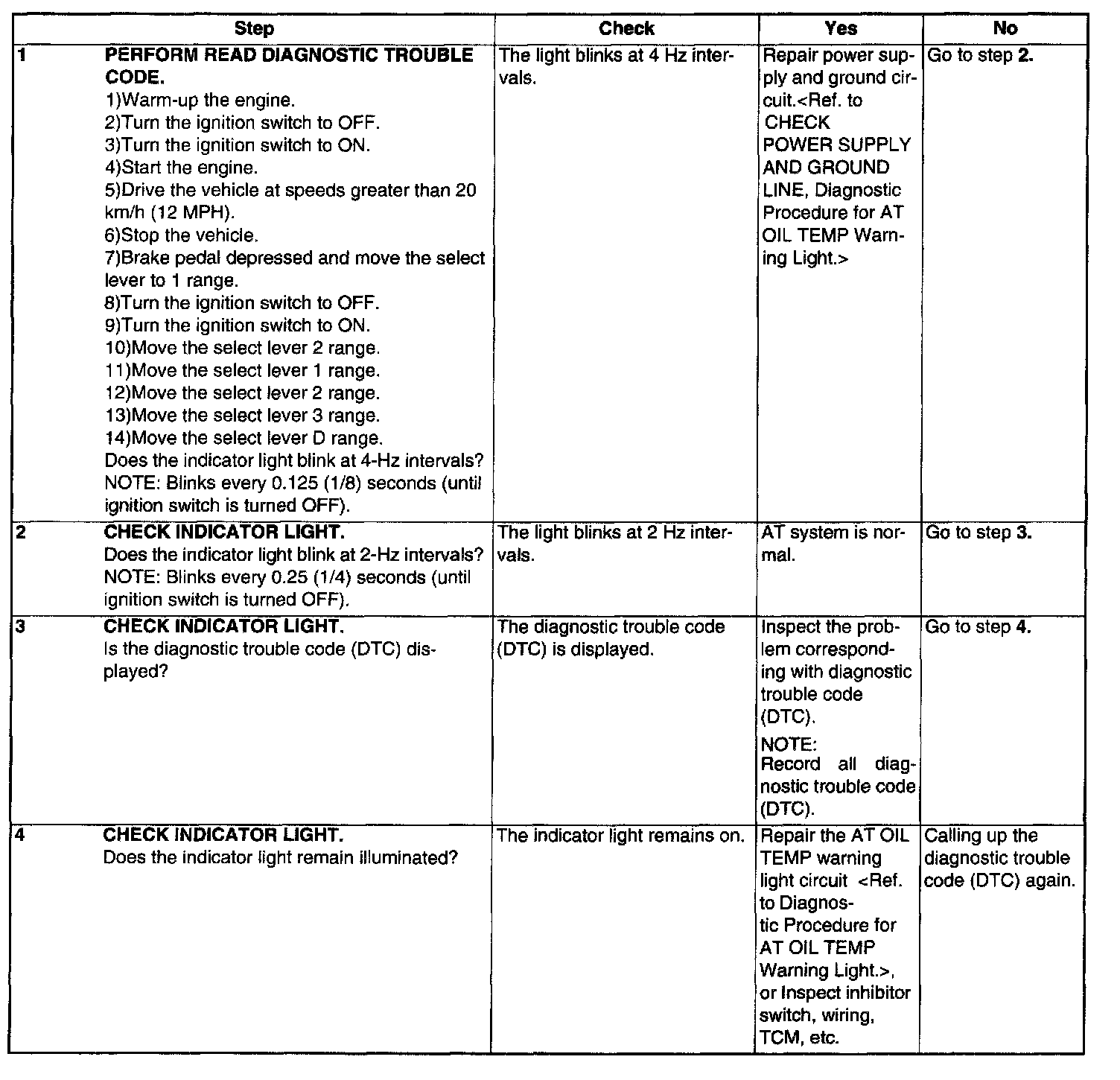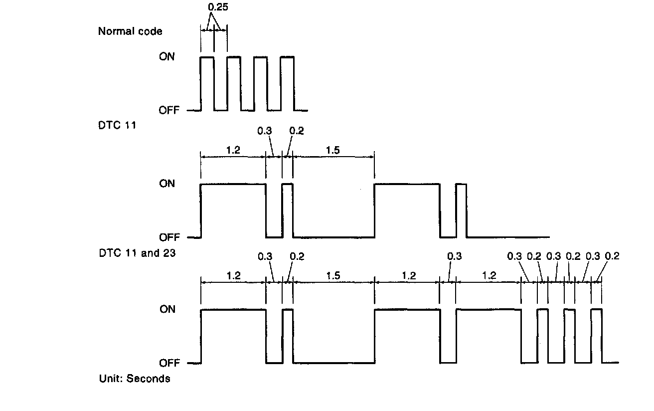 The AT OIL TEMP warning light flashes the code corresponding to the faulty part. The long segment (1.2 sec on) indicates a "ten", and the short segment (0.2 sec on) signifies a "one".