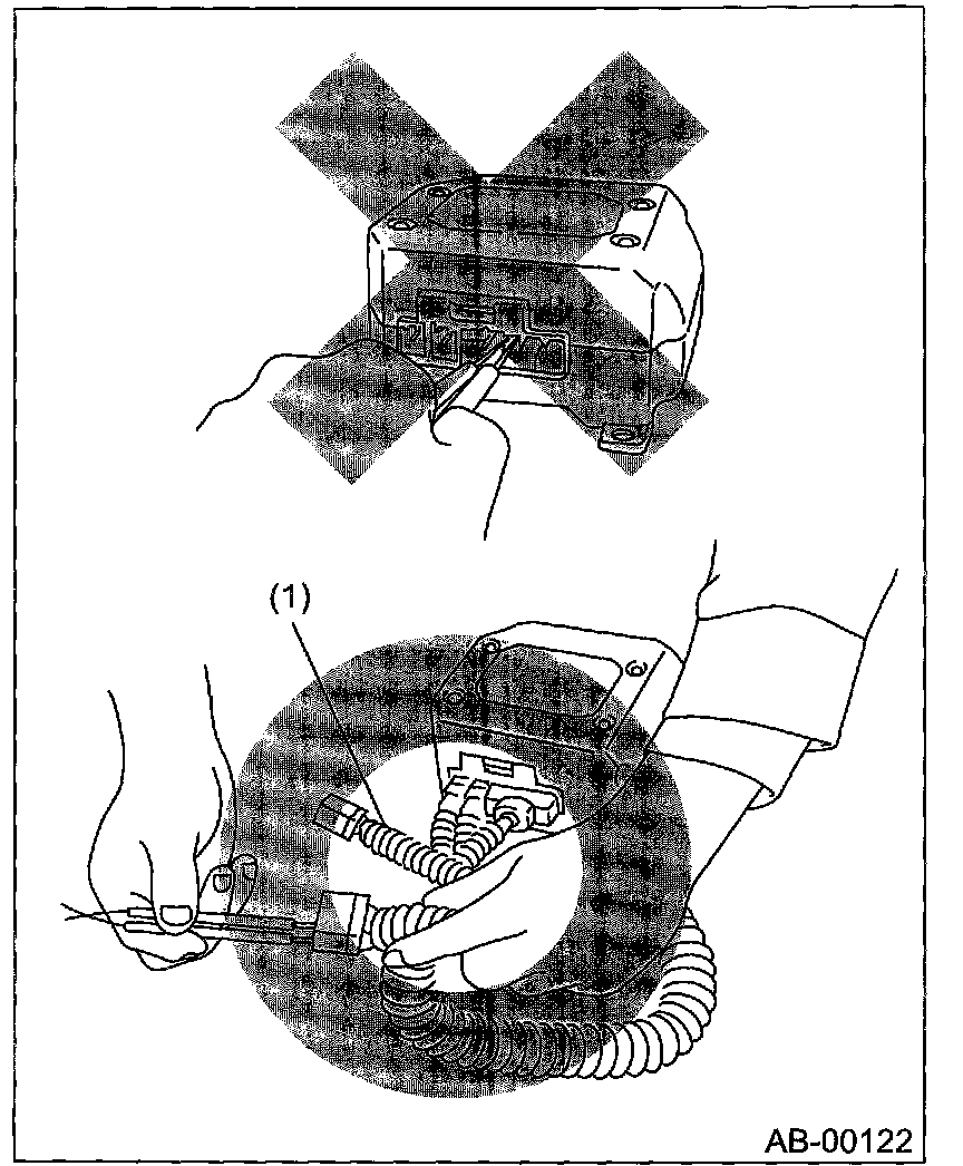 - When checking, use a test harness (1). Do not directly apply the tester probe to any connector terminal of the airbag. Damage to the connector terminal may cause the airbag to activate erroneously.