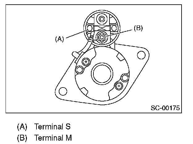 2. Disconnect the connector from terminal M, and then connect the positive terminal of battery and terminal M using a lead wire and ground terminal to starter body.
