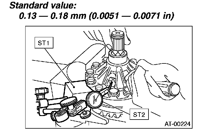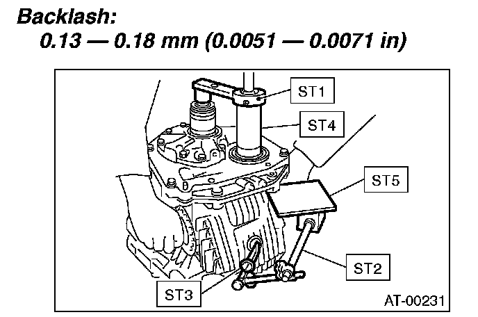 8. Turn the drive pinion several rotations with ST1 and check to see if the backlash is within the standard value with ST2, ST3, ST4 and ST5.