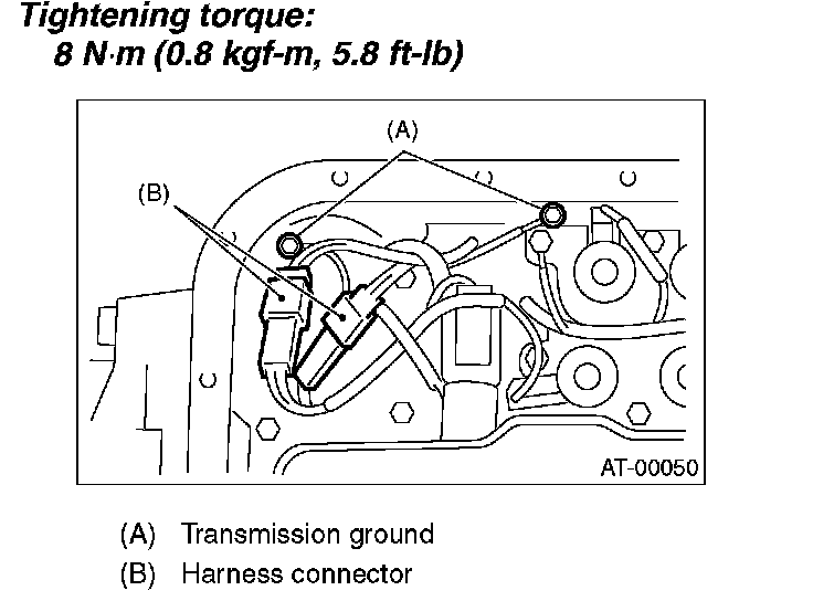 Tightening torque (Transmission ground cable and ATF temperature sensor): 8 Nm (0.8 kgf-m, 5.8 ft. lbs.)
