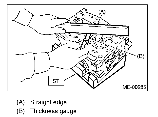 3. Measure the warping of the cylinder head surface that mates with crankcase using a straight edge and thickness gauge. If the warping exceeds the limit, regrind the surface with a surface grinder.