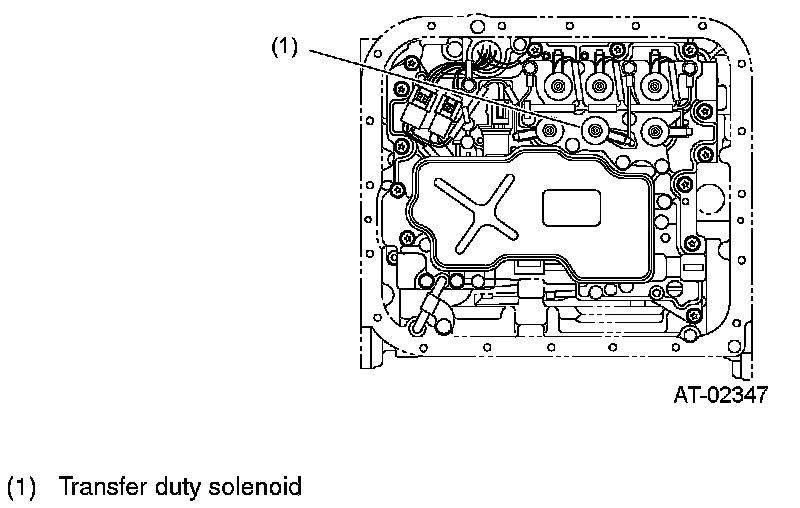 This solenoid is mounted on the transmission control valve. This adjusts the pressure applied to the transfer in response to the duty instructions from the TCM. Torque distribution to the front and rear is controlled by properly controlling the engagement force of the transfer clutch.